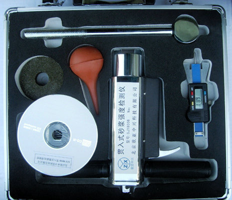 貫入法檢測是根據測釘貫入砂漿的深度和砂漿抗壓強度間的相關關系,采用壓縮工作彈簧加荷,把一測釘貫入砂漿中,由測釘的貫入深度通過測強曲線來換算砂漿抗壓強度的一種新型的現場檢測方法。